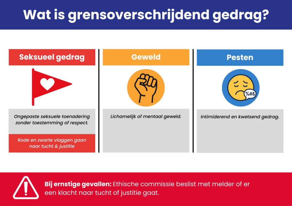 Bij seksueel gedrag gaat het om ongepaste toenadering zonder toestemming of respect. Dergelijk gedrag wordt zeer ernstig genomen: rode en zwarte vlaggen kunnen leiden tot tuchtmaatregelen en zelfs juridische stappen.