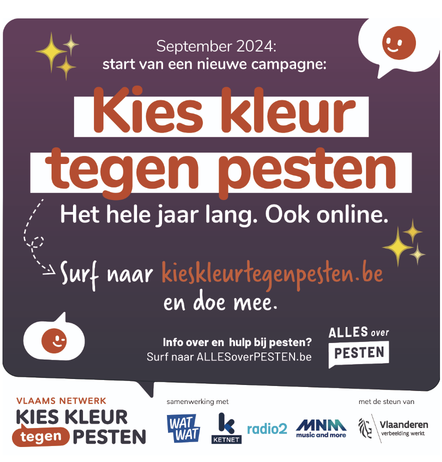 Lees meer over deze bouwsteen en laat je inspireren door nog andere goede praktijken op kieskleurtegenpesten.be/bouwstenen . Vragen over of hulp bij pesten: surf naar ALLESoverPESTEN.be