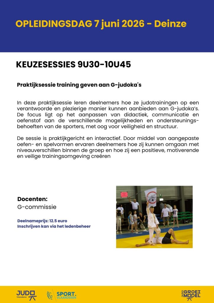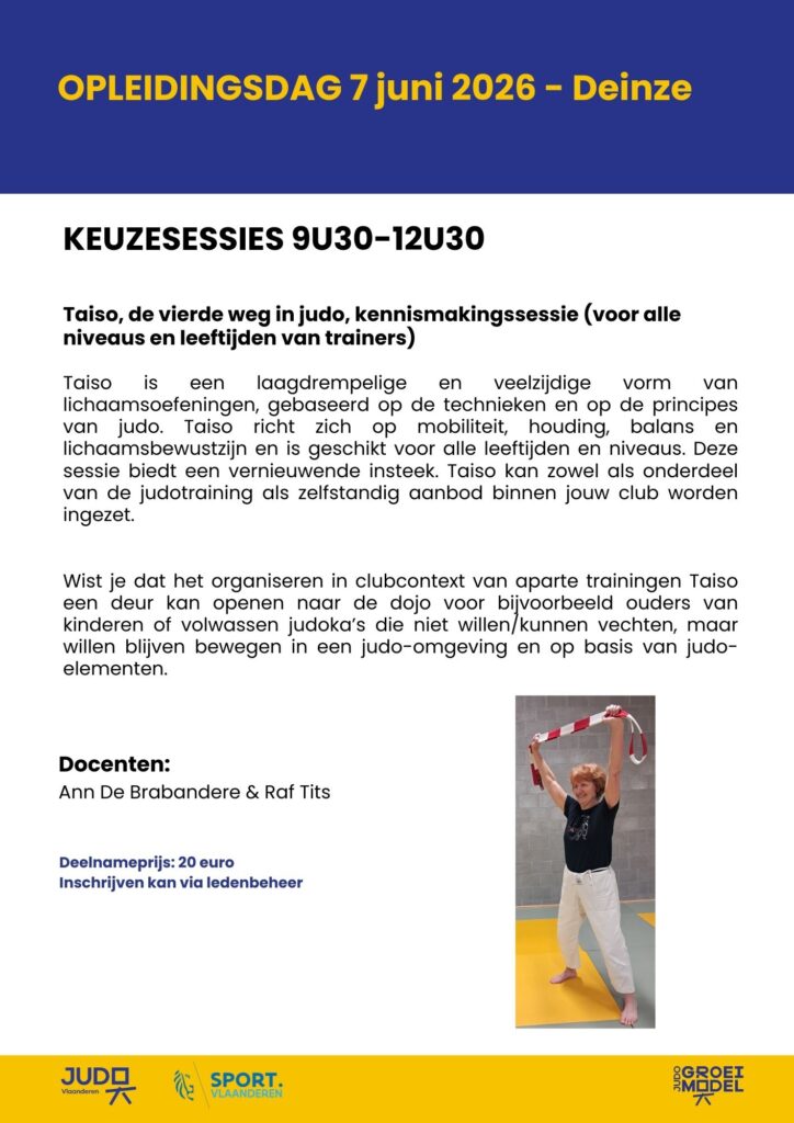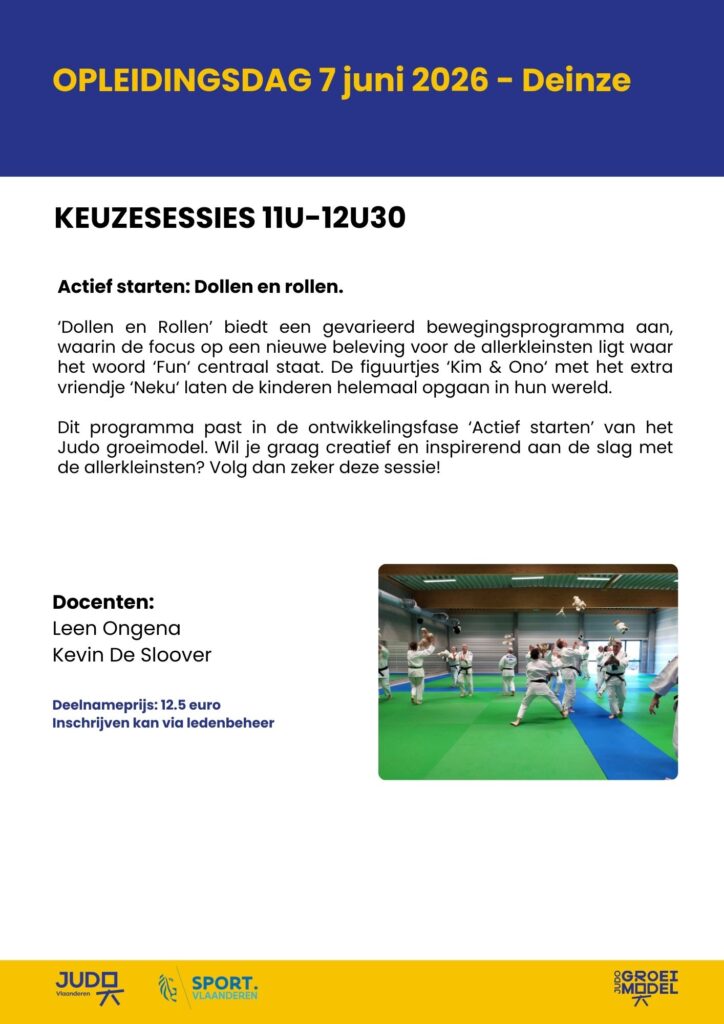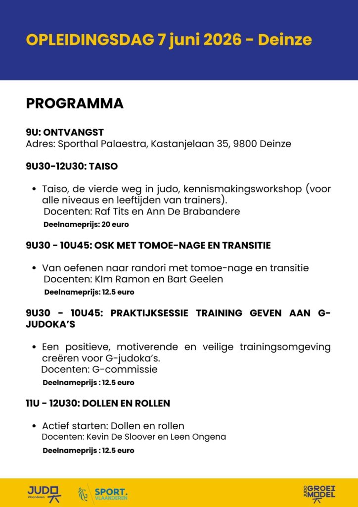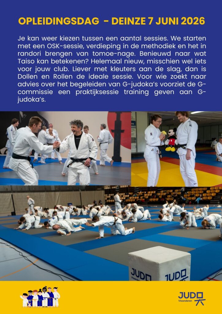 BURST – In 2026 organiseren we opnieuw een opleidingsdag in Deinze. Er staan heel wat boeiende sessies op het programma. We starten met een OSK-sessie, verdieping in de methodiek en het in randori brengen van tomoe-nage. Benieuwd naar wat Taiso kan betekenen? Helemaal nieuw, misschien wel iets voor jouw club. Liever met kleuters aan de slag, dan is Dollen en Rollen de ideale sessie. Voor wie zoekt naar advies over het begeleiden van G-judoka’s voorziet de G-commissie een praktijksessie training geven aan G-judoka’s.