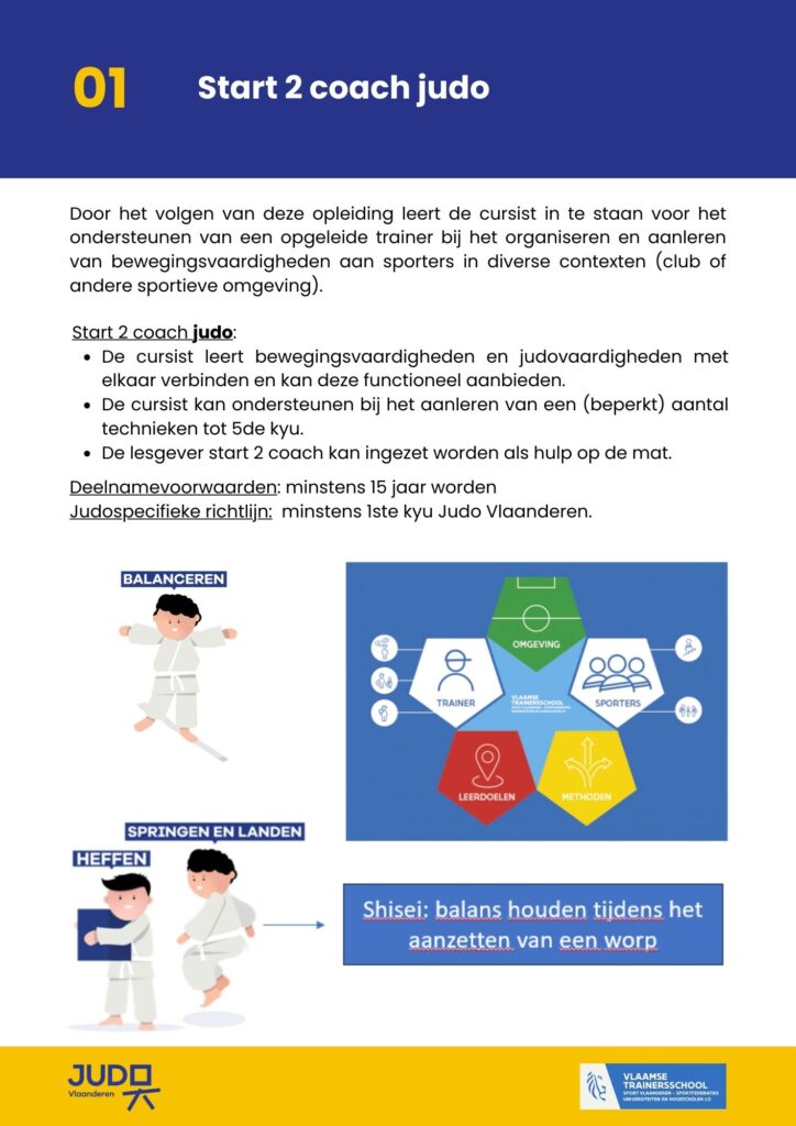 Tot eind 2022 werd de opleiding tot aspirant-initiator op dit laagste niveau aangeboden. De opleiding Start 2 coach judo is inhoudelijk meer gericht op de didactische aanpak op de mat. Judotechniek komt m.a.w. in vergelijking met de aspirant-iniator minder aan bod tijdens deze opleiding.