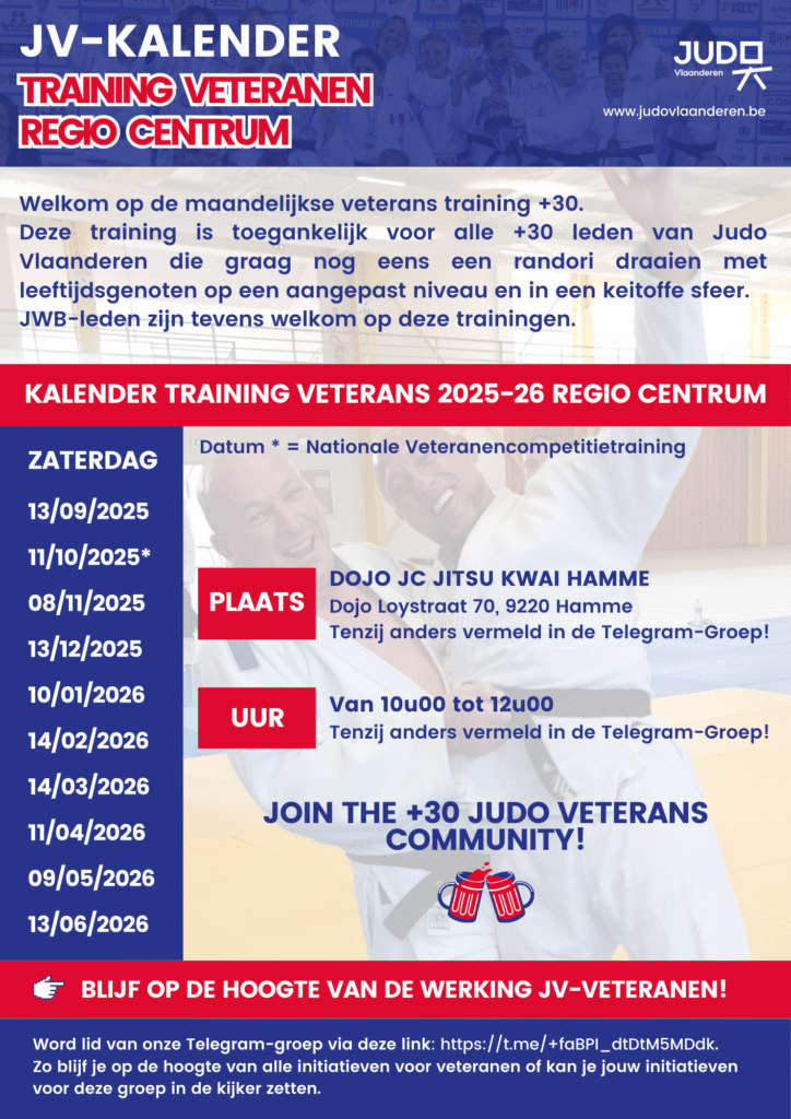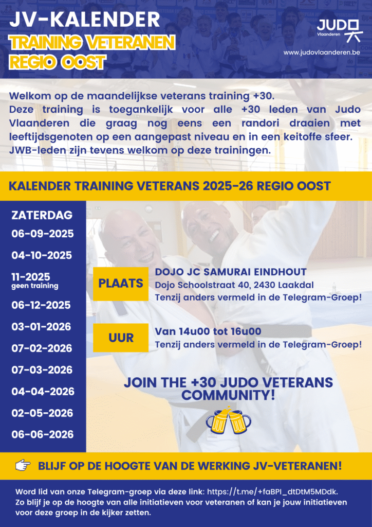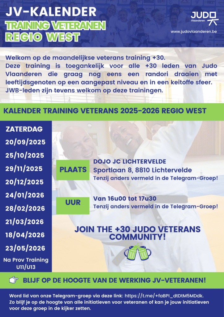 Op deze pagina willen we onze veteranen op de hoogte houden van alle organisaties (wedstrijden, trainingen, ontmoetingen, …) die zowel in binnen- als buitenland georganiseerd worden. Heb je vragen inzake de veteranenwerking van JV? Ideeën? Opbouwende kritiek? Neem dan contact met Silvia Buysens.